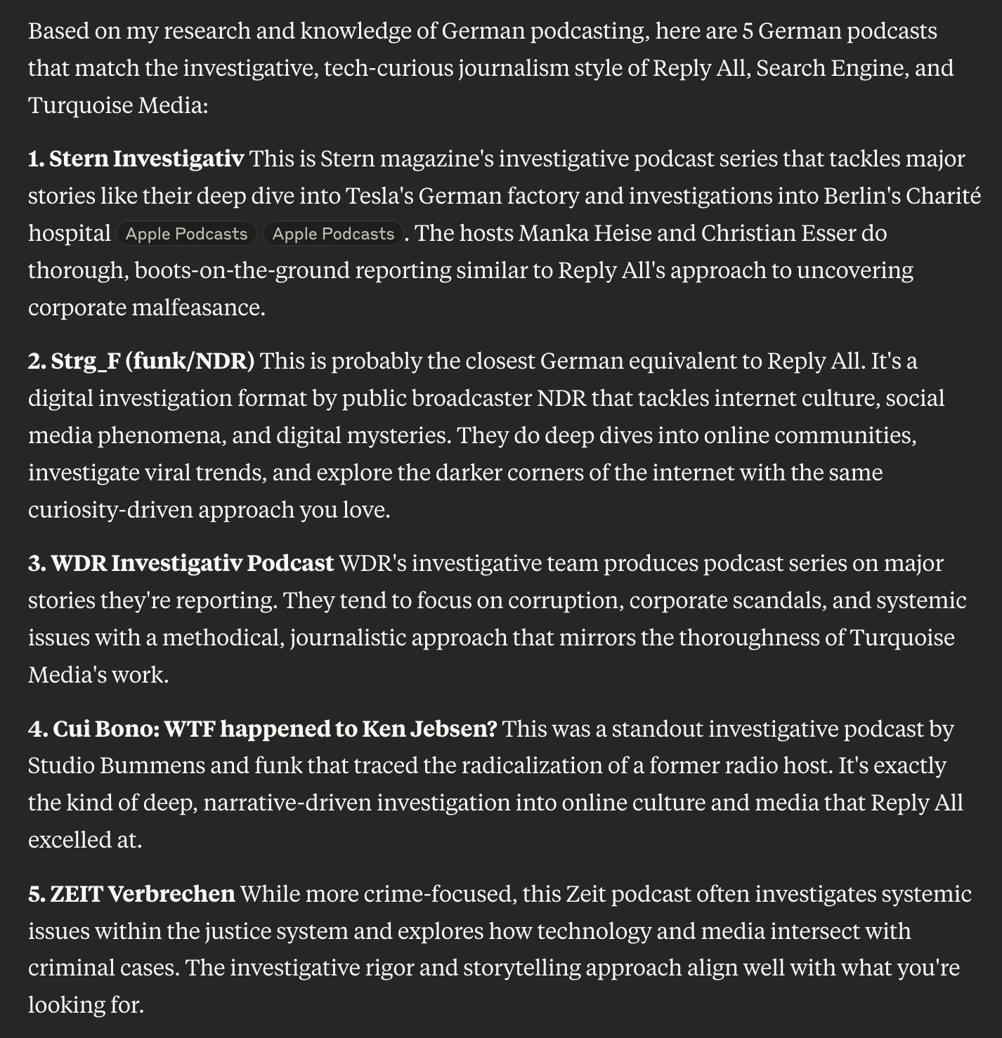 LLMs can be of great help with discovery, too, by the way: tell the bot your favourite podcasts in English and it will find you similar ones in your target language: